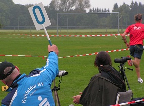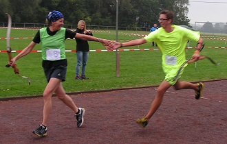Dominic Schröder vom Kuhfelder SV als Startläufer, Heike Niederbröker und Schlussläufer