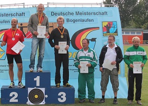 ![]() Mit nur einer Strafrunde und einer herausragenden Zeit von 18:54,3 min verteidigt Lorenz Aab erfolgreich seinen Deutschen Meistertitel im Bogenlaufen in der Klasse ü45 Traditionell. Nach einem spannenden Finish folgen mit je 4 Strafrunden Detlef mit 21:09,9 min und Hans-Peter mit 21:21,3 min. ![]() ![]() ![]() |