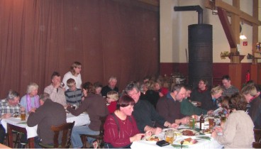 geschmückter Tafel. Ein riesiger Holzofen schlägt uns