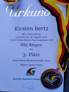 Kirsten startete in der Klasse Damen ü40 Langbogen. Sie hatte ja